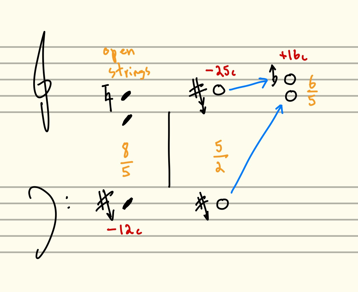 … yields voice-leading that reminds me of a cross-relation but technically is super different. While in a conventional cross-relation a pitch is immediately followed by a chromatic alteration of itself in a different voice (and sometimes the original and its chromatic alteration overlap, as in the occasionally-gruesome-but-usually-delightful English cadence), here the third of a chord is transformed by a change in bass underneath (which is reminiscent of harmonic motion by 3rd, where, for instance, a C-major chord followed by an A-major chord will force a change of C to C#). In mm. 77-79 in the excerpt above, the second violin’s A#, which is a just-tuned major 10th over the open F# (itself already “low” because it is just-tuned against the open D in the scordatura, as indicated by the down-arrow in the accidental), is some 25 cents low to equal-temperament, but when the bass changes to the open G, the A# becomes a Bb, a just-tuned minor 3rd to the open G and about 16 cents sharp to equal-temperament: