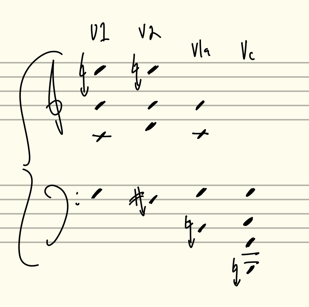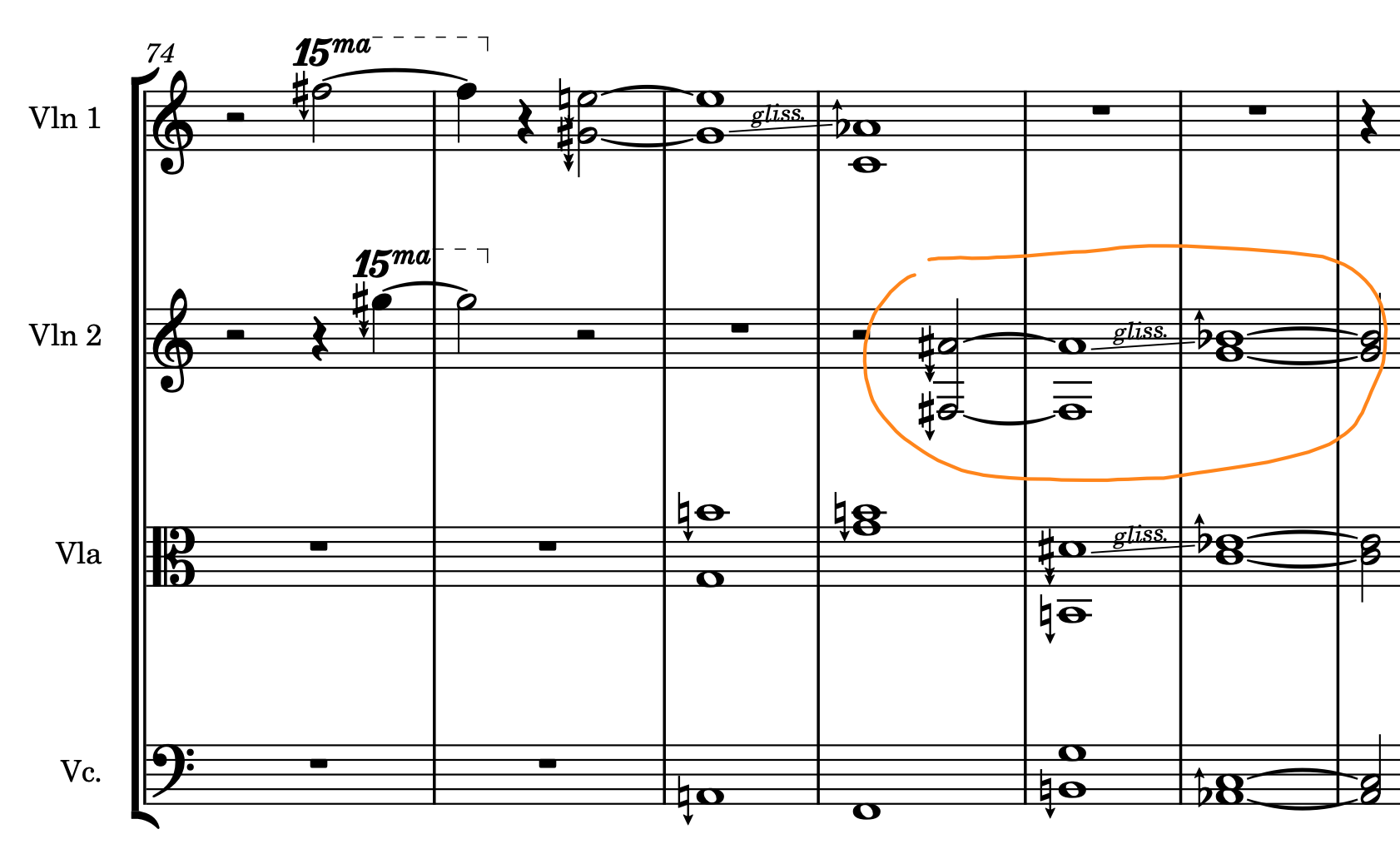 So the shift of bass from F# to G (both open strings) warps the A#/Bb by almost a quarter-tone—so much for a common-tone! In practice, the violinist just slightly rolls the finger up to make this move happen; no sliding here. Similar moves happen in the violin 1 part just before, and viola just after. I confess I love this little warped chorale section! And it’s a bit disorienting. If you want to explore more, here are the score and parts.